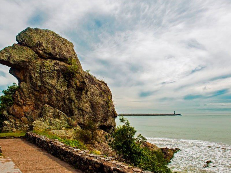 Grande rocha em formato de pássaro com vista para o Atlântico, trilha pavimentada e estacionamento.